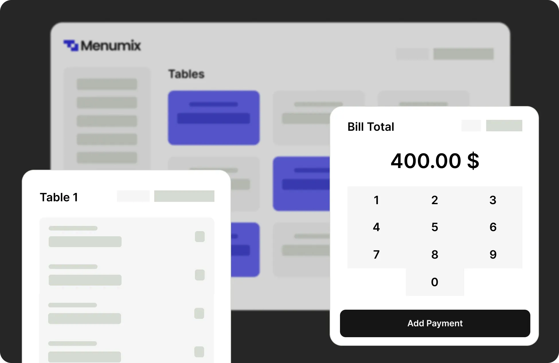 Suivez la facture de chaque table en temps réel. Acceptez plusieurs méthodes de paiement, divisez les factures, fusionnez les tables et gérez les commandes depuis un seul tableau de bord.